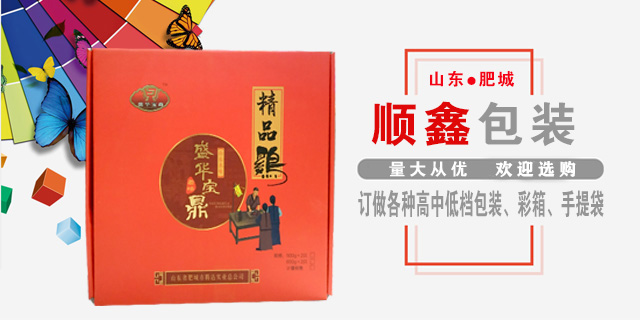 肥城顺鑫包装材料有限公司座落于举世闻名的泰山脚下,肥桃之乡,公司致力于各种高、中、低档包装、彩箱、手提袋等的设计与制作。我公司倡导“以人为本、科学管理、重合同、守信誉”的企业精神,以优的产品,好的服务,良好的信誉,竭诚为广大客户提供性价比较高的产品及满意的服务。